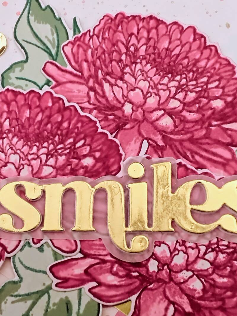 For my card, I used the Build a flower semi-double Chrysantheum, a four layered stamp set for the flowers, the leafs have three layers. I didn't wanted my stamps to have black lines, I wanted them in color, so it was less harsh. I used an Altenew paperpad from which I made thin sliced paperparts. I placed these at a diagonal. I used Altenew gold mirror cardstock to break between the different colors pink. On the upper half of the card, I splattered with two colors of Ranger distress mica stain, and to bring back the gold, I also splattered with foundry wax, which I dried with my heat tool. I made three flowers for a nice composition and five leaves. I took the sentiment of the timeless sentiments 2. I die cutted the sentiment out of the same gold mirror cardstock and layered it on three white ones, to give it more dimension. The shadow layer I took out of vellum and under that I layered another white sentiment, so that created a bit of air between the flowers and vellum. And last but not least, a few gold sequins.