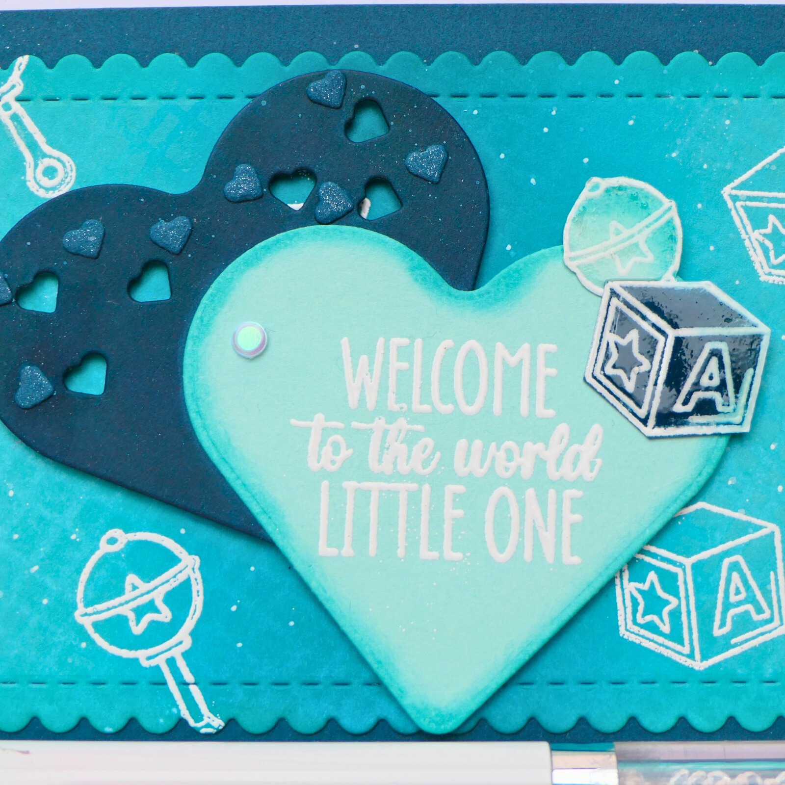 For the focal point, I used two heart dies from the Heart Donut Builder Craft Dies and layered the two hearts slightly over each other. The front heart holds the sentiment “welcome to the world little one” and I added a few of the extra stamped elements for a playful touch.